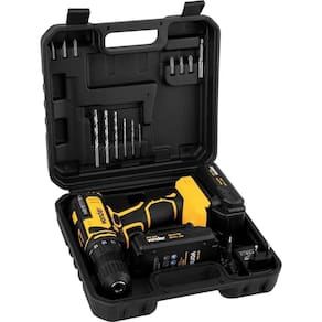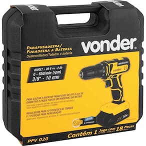 Conteúdo da embalagem: 1 Parafusadeira/furadeira. Acompanha: 1 maleta, 2 baterias de 20 V, 1 fonte de carregamento bivolt automática, 6 brocas de aço rápido (1,5 mm, 2,5 mm, 3,0 mm, 4,0 mm, 5,0 mm e 6,0 mm), 6 bits (2 fendas (5 mm e 6 mm), 2 phillips (PH1 e PH2) e 2 pozidrive (PZ1 e PZ2)) e 1 soquete magnético encaixe de 1/4 + 1 bits ponta dupla (ponta PH2 e ponta fenda 5.5 mm).
