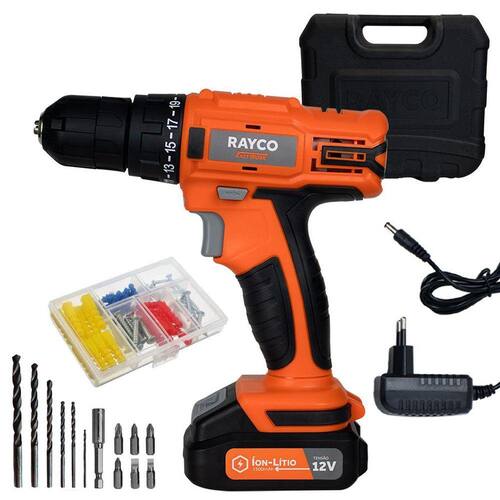 Parafusadeira furadeira bateria 12v maleta 73 peças profissional rayco