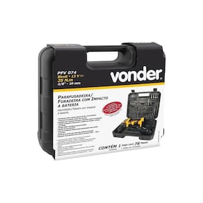 Parafusadeira/ Furadeira Bateria Vonder Pfv074 12v + Kit... Informações do Produto Parafusadeira/Furadeira com Impacto a bateria, 12 V, Carregador Bivolt Automático, Jogo com 74 Peças, PFV 074 - 60.01.074.000 Indicada para soltar e apertar parafusos de até 6 mm de diâmetro e fazer furos em madeiras, metais e/ou alvenaria. Tempo de carregamento da bateria: 3 a 5 horas. Acompanha 74 acessórios encaixados perfeitamente na maleta, conferindo organização, praticidade e maior vida útil dos acessórios. Possui regulagem para 18 posições de torque e velocidade variável (2 velocidades).... Informações do Produto Parafusadeira/Furadeira com Impacto a bateria, 12 V, Carregador Bivolt Automático, Jogo com 74 Peças, PFV 074 - 60.01.074.000 Indicada para soltar e apertar parafusos de até 6 mm de diâmetro e fazer furos em madeiras, metais e/ou alvenaria. Tempo de carregamento da bateria: 3 a 5 horas. Acompanha 74 acessórios encaixados perfeitamente na maleta, conferindo organização, praticidade e maior vida útil dos acessórios. Possui regulagem para 18 posições de torque e velocidade variável (2 velocidades).... Ean: 7893946543822