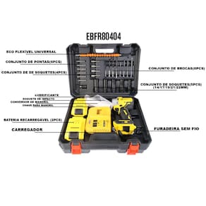 Acompanha na maleta (EBFR80404): - 1 Parafusadeira/Furadeira de Impacto EmbuLED 21V - 2 Baterias recarregáveis - 1 Carregador bivolt - Conjunto de brocas (6 pcs) - Conjunto de pontas (6 pcs) - Conjuntos de soquetes (4 pcs e 5 pcs – 14 a 22mm) - Soquete de impacto, chave e conversor para mandril - Eixo flexível universal - Lubrificante e acessórios extras