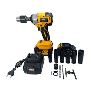 1x Parafusadeira 2x Baterias 48v 1x Carregador bivolt 1x Adaptador com rosca para mandril 1x Mandril 1x Adaptador para pontas de bits 1x Bits com ponteira fenda/philips 2x Brocas 6x Soquete de impacto em mm: 22mm, 21mm, 20mm, 19mm, 18mm, 17mm 1x Maleta de 1x Bastão de lubrificação