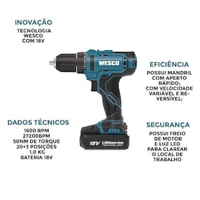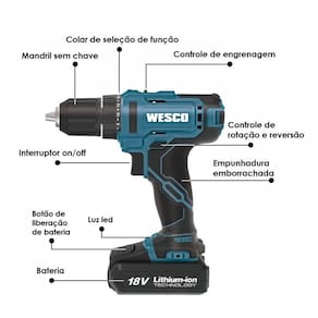 Parafusadeira furadeira impacto 18v ws2390 wesco com bateria Voltagem: biv Parafusadeira e furadeira de impacto com 18v modelo ws2390 - 13 mm Com bateria e carregador