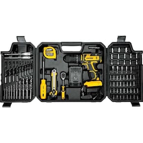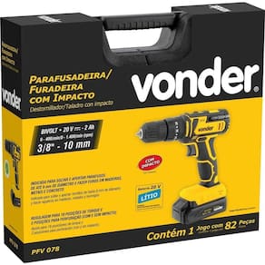 Conteúdo da embalagem: 1 Parafusadeira/furadeira a bateria. Acompanha: 1 maleta, 1 bateria de 20 V, 1 fonte de carregamento bivolt automática e 78 acessórios, sendo: 2 brocas chatas para madeira (13 mm e 16 mm), 10 brocas para madeira (3 mm, 3,5 mm, 4 mm, 4,5 mm, 5 mm, 6 mm, 7 mm, 8 mm, 9 mm e 10 mm), 10 brocas em aço rápido (3 mm, 3,5 mm, 4 mm, 4,5 mm, 5 mm, 6 mm, 7 mm, 8 mm, 9 mm e 10 mm), 13 soquetes em aço cromo vanádio encaixe 1/4 (4 mm, 4,5 mm, 5 mm, 5,5 mm, 6 mm, 7 mm, 8 mm, 9 mm, 10 mm, 11 mm, 12 mm, 13 mm e 14 mm), 5 soquetes sextavados magnéticos (6 mm, 8 mm, 10 mm, 12 mm e 13 mm), 1 chave catraca 1/4, 8 bits 25 mm philips (2 peças PH0, 2 peças PH1, 2 peças PH2 e 2 peças PH3), 9 bits 25 mm fenda (2 peças SL 3 mm, 2 peças SL 4 mm, 2 peças SL 5 mm, 2 peças SL 6 mm e 1 peça SL 7 mm), 4 bits 25 mm pozidrive (1 peça PZ0, 1 peça PZ1, 1 peça PZ2 e 1 peça PZ3), 6 bits 25 mm hexalobular (T10, T15, T20, T25, T27 e T40), 5 bits 25 mm allen/hexagonal (H2, H3, H4, H5 e H6), 1 soquete magnético encaixe de 1/4, 1 cabo adaptador encaixe 1/4, 1 bit adaptador, 1 Trena 5 metros e 1 estilete.
