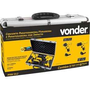 Conteúdo da embalagem: 1 - Parafusadeira / furadeira com mandril 3/8" + 1 parafusadeira com impacto. Acompanha: 2 - baterias de íons de lítio, 1 - carregador bivolt e 1 maleta de alumínio.