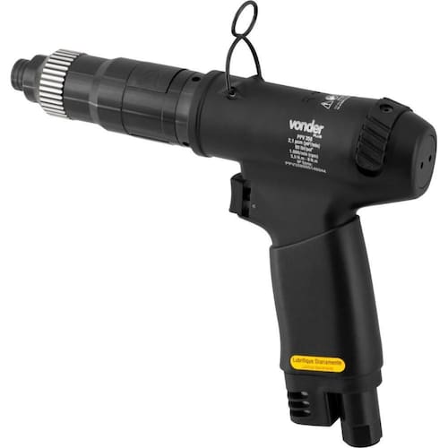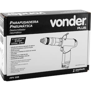 Marca: VonderConteúdo da embalagem:1 Parafusadeira. Acompanha: 1 gancho para balancim e 1 chave para ajuste do torque.Destaques e diferenciais:Possui ajuste de torque, fácil acesso a mudança no sistema de reversão e silenciador. Conta com sistema de troca rápida dos bits e desligamento automático Shut-off , garantindo maior segurança e agilidade na operação. Conta com acionamento por gatilho. Ergonômica, proporciona conforto e praticidade ao operador.Aplicações e dicas de uso:Indicada para diversas operações de aperto e desaperto de parafusos e porcas em geral. Uso industrial. Mantenha a ferramenta constantemente lubrificada e utilize sempre o regulador e o lubrificador de linha com óleo pneumático. .Detalhes TécnicosModelo: PPV358 Consumo de ar: 2,1 pcm pé/min Pressão de trabalho: 90 lbf/pol Tipo do encaixe da parafusadeira: Sextavado - 1/4 - 6,35 mm Tipo de acionamento: Acionamento por gatilho Sistema de reversão: Sim Rotações por minuto rpm : 1.000/min Torque: 3,5 N.M - 8,0 N.M Rosca de entrada de ar: 1/4 NPT fêmea Diâmetro da mangueira: 3/8 Aceleração transmitida nas mãos - braços do operador - ah: 0,61 m/s Incerteza da aceleração transmitida nas mãos - braços do operador - k: 0,56 m/s Massa aproximada peso kg : 1,236 kg - E CDC : legal: 90 dias + contratual: 3 meses Para locadoras, única e exclusiva de 90 dias