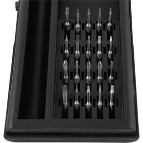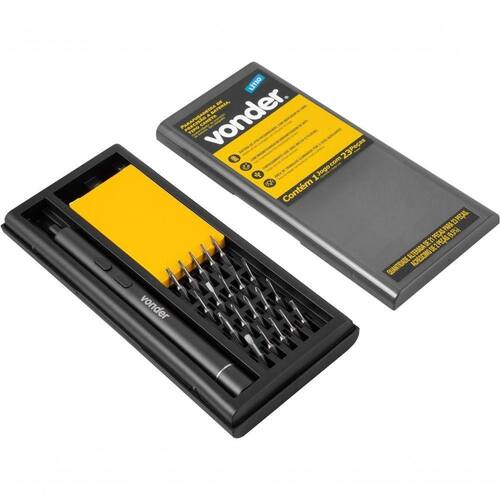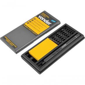 1 Parafusadeira de precisão a bateria. Acompanha: 1 estojo com magnetizador/desmagnetizador, 1 cabo para carregamento (USB), 2 bits estrela (P, 2 P5), 1 bits triângulo (?3.0), 2 bits Allen (1,5 mm, 2 mm), 5 bits Phillips (PH0000, PH000, PH00, PH0 e PH1), 3 bits fenda (1,5 mm, 2 mm e 2,5 mm), 3 bits hexalobular (T2, T3 e T4), 3 bits hexalobular com furo (T5, T6 e T8) e 1 bits Y (Y0,6).