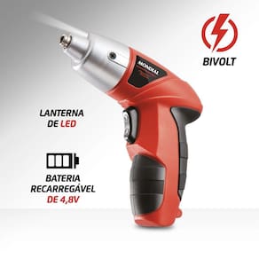Com BATERIA RECARREGÁVEL BIVOLT, a Parafusadeira Recarregável 4,8V FPF-05M vermelha é portátil de verdade e acompanha uma MALETA COM ACESSÓRIOS. Ela ainda tem REVERSÃO ELETRÔNICA, LANTERNA LED E 200 RPM DE VELOCIDADE. Ela é portátil porque tem BATERIA DE 4,8V BIVO LT, que pode ser recarregada tanto em tomada de 110V quanto em 220V, e o indicador de bateria avisa quando é a hora de carregar. Ela acompanha uma MALETA, com 1 prolongador, 34 bits, 8 soquetes e 1 adaptador. É o KIT COMPLETO para fazer qualquer trabalho. Com VELO CIDADE DE 200 RPM, ela é mais rápida. Seu MANDRIL TEM FIXADOR MAGNÉTICO, fazendo ela ser MAIS PRÁTICA ao usar e na hora de trocar as brocas. Já seu TORQUE É 3,0 Nm, o que dá mais força. Com a REVERSÃO ELETRÔNICA, você pode reverter o sentido de giro do motor. E a LANTERNA DE LED da Parafusadeira Recarregável 4,8V FPF05M deixa fácil trabalhar até em lugares escuros. Tudo com a QUALIDADE MONDIAL , garantia de fábrica. A Mondial é a escolha de milhões de consumidores.