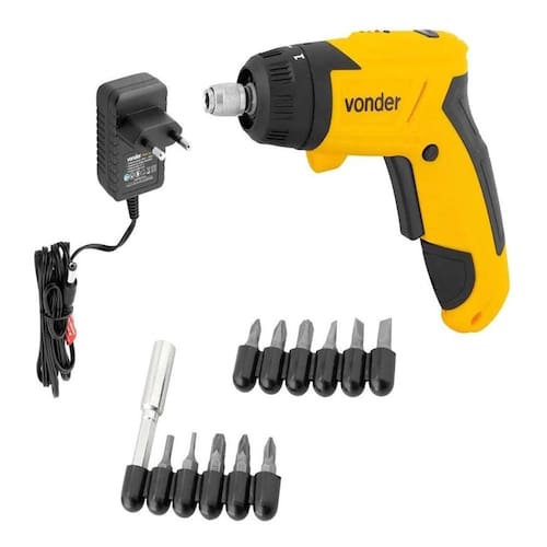 Parafusadeira Vonder PBV 120 C/12 Peças A Bateria Bivolt A Vonder trás a você a parafusadeira a bateria e acessórios PBV 120 que é mais que indicada para fixar e soltar parafusos. Possuindo regulagem para 7 posições de torque e 1 posição para perfuração que permite realizar furos de até 3mm em madeira e metal. Características:- Marca: Vonder- Modelo: PBV 120- Tipo de velocidade: Variável- Rotação: 180/min- Tipo de Encaixe: Sextavado 1/4" (6,35mm)- Sistema de reversão: Sim- Aceleração transmitida nas mãos - braços do operador - ah: 0,566 m/s²- Incerteza da aceleração transmitida nas mãos - braços do operador - k: 1,5 m/s²- Tensão da bateria: 3,6 V- Tipo de bateria: Lítio- Tensão do carregador de bateria: 127 V-220 V - Bivolt automático- Frequência: 50 Hz/60 Hz Conteúdo da Embalagem:- 1X Parafusadeira- 1X Fonte Bivolt Automática- 3X Fenda ( 4mm, 5mm e 6mm )- 3X Philips ( PH1, PH2 E PH3 )- 3X Pozidrive ( PZ1, PZ2 E PZ3 )- 2X Allen ( 2mm e 3mm )- 1X Soquete Magnético Ref:. 6001120360 Garantia: 90 dias*Imagens meramente ilustrativas.