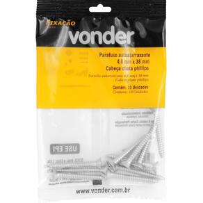 Marca: VonderConteúdo da Embalagem:1 Cartela com 10 parafusosDestaques e diferenciais:Possui acabamento zincado que aumenta a resistência contra corrosão/oxidação. Conta com cabeça chata/cônica que oferece acabamento rente à superfície.Aplicações e dicas de uso:Indicado para fixações de acessórios e objetos em paredes de alvenaria e concreto com buchas de fixação. Permite fixações em móveis tubulares, equipamentos fabricados com chapas metálicas finas e esquadrias de alumínio. Muito utilizado na fabricação de móveis em madeira e MDF.Características Técnicas:Material do parafuso autoatarraxante: Aço carbono Acabamento do parafuso autoatarraxante: Zincado Diâmetro da rosca do parafuso autoatarraxante: 4,8 mm Comprimento do parafuso autoatarraxante: 38,0 mm Tipo da cabeça do parafuso autoatarraxante: Chata Tipo da fenda do parafuso autoatarraxante: Phillips fenda cruzada