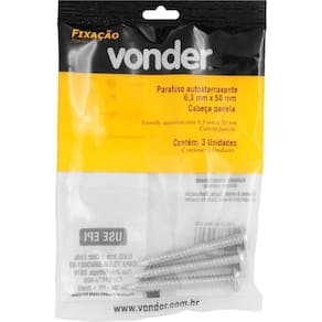 Marca: VonderConteúdo da Embalagem:1 Cartela com 3 parafusosDestaques e diferenciais:Possui acabamento zincado que aumenta a resistência contra corrosão/oxidação. Conta com cabeça base plana que oferece melhor fixação.Aplicações e dicas de uso:Indicado para fixações de acessórios e objetos em paredes de alvenaria e concreto com buchas de fixação. Permite fixações em móveis tubulares, equipamentos fabricados com chapas metálicas finas e esquadrias de alumínio. Muito utilizado na fabricação de móveis em madeira e MDF.Características Técnicas:Material do parafuso autoatarraxante: Aço carbono Acabamento do parafuso autoatarraxante: Zincado Diâmetro da rosca do parafuso autoatarraxante: 6,3 mm Comprimento do parafuso autoatarraxante: 50,0 mm Tipo da cabeça do parafuso autoatarraxante: Panela Tipo da fenda do parafuso autoatarraxante: Simples Marca: Não Informado