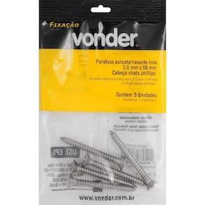 Marca: VonderConteúdo da Embalagem:1 Cartela com 5 parafusosDestaques e diferenciais:Fabricado em aço inox, proporcionando excelente resistência contra corrosão/oxidação. Conta com cabeça chata/cônica que oferece acabamento rente à superfície.Aplicações e dicas de uso:Indicado para fixações de acessórios e objetos em paredes de alvenaria e concreto com buchas de fixação. Permite fixações em móveis tubulares, equipamentos fabricados com chapas metálicas finas e esquadrias de alumínio. Muito utilizado na fabricação de móveis em madeira e MDF.Características Técnicas:Material do parafuso autoatarraxante: Inox Acabamento do parafuso autoatarraxante: N/A Diâmetro da rosca do parafuso autoatarraxante: 5,5 mm Comprimento do parafuso autoatarraxante: 50,0 mm Tipo da cabeça do parafuso autoatarraxante: Chata Tipo da fenda do parafuso autoatarraxante: Phillips fenda cruzada Marca: Não Informado Ean: 7893946625030