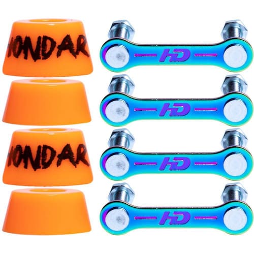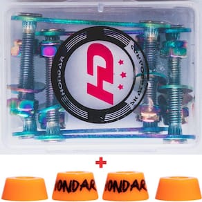 Os parafusos grampos da Hondar, foram fabricados pensando em facilitar seu dia. Usando apenas uma única chave de boca é possível apertá-los ou tirá-los do shape, com mais agilidade. Já os amortecedores Hondar 90A são fabricados e moldados com poliuretano de alta qualidade que proporciona melhor absorção de impacto dos trucks, com precisão na hora de virar o skate em curvas fechadas ou transições bem rápidas e agressivas.