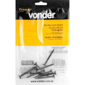 Marca: VonderConteúdo da Embalagem:1 Cartela com 10 parafusos para drywallDestaques e diferenciais:Possui acabamento zincado, proporcionando maior resistência contra oxidação/corrosão.Aplicações e dicas de uso:Indicado para fixações em drywallCaracterísticas Técnicas:Diâmetro da rosca do parafuso para drywall: 3,5 mm Comprimento do parafuso para drywall: 35,0 mm Material do parafuso para drywall: Aço carbono