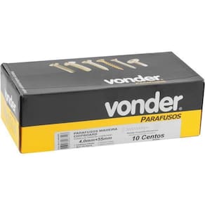 Conteúdo da embalagem1 Caixa com 1.000 parafusosAplicações e dicas de usoIndicado para fixações em madeiras e derivados, como: aglomerados, pínus e MDF. Pode ser utilizado também em alvenaria com o auxílio de uma bucha. Conhecido como parafuso CHIPBOARD.Destaques e diferenciaisPossui acabamento bicromatizado, proporcionando maior resistência contra oxidação/corrosão DETALHES TÉCNICOS Tipo de cabeça do parafuso madeira Chata - fenda cruzada/pozidrive Diâmetro do parafuso madeira: 4,0 mm Comprimento do parafuso madeira: 55,0 mm Material do parafuso madeira: Aço carbono Acabamento do parafuso madeira: Bicromatizado - zincado amarelo Marca: Não Informado