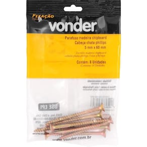 Marca: VonderConteúdo da Embalagem:1 Cartela com 8 parafusos madeiraDestaques e diferenciais:Possui acabamento bicromatizado, que aumenta a resistência contra corrosão/oxidação, além de cabeça tipo phillips, que proporciona maior força de aperto e menor possibilidade da chave ou bits escapar e riscar a peça que está sendo trabalhada.Aplicações e dicas de uso:Indicado para fixações em madeiras e derivados, como: aglomerados, pinus, MDF, entre outros.Características Técnicas:Tipo de cabeça do parafuso madeira: Chata - fenda cruzada/phillips Diâmetro do parafuso madeira: 5,0 mm Comprimento do parafuso madeira: 60,0 mm Material do parafuso madeira: Aço carbono