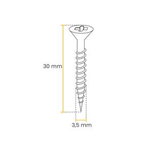 PARAFUSO CHIPBOARD CH PHS BI 3,5X30 CX-1000 MKParafuso MK chipboard autoatarraxante para madeira com aperto PhilipsUsado no ramo da indústria moveleira e na construção civil, são muito utilizados para a fixação de caixilhos de portas e esquadrias de janelas fabricadas em madeira, fixação de dobradiças e rodapés. Podem também ser utilizados com buchas de nylon ou plástica para fixação de objetos em paredes de concreto e alvenaria.CARACTERÍSTICAMarca: MKTipo de cabeça: ChataMaterial: Aço bicromatizadoTipo de parafuso: ChipboardIndicado: MDF, madeira, aglomerado, e outrosRosca: AutoatarraxanteDIMENSÕESComprimento: 16 mmDiâmetro: Ø 3,5 mmBroca indicada: Ø 2 mmEmbalagem: 1000 PeçasINFORMAÇÕES ADICIONAIS• Confira outros produtos na nossa loja, temos uma grande variedade de ferragens para moveis e vários modelos de ferramentas.
