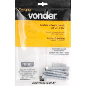 Marca: VonderConteúdo da Embalagem:1 Cartela com 5 parafusos sextavadosDestaques e diferenciais:Possui acabamento zincado, proporcionado maior resistência a oxidação/corrosão.Aplicações e dicas de uso:Indicado para fixações em geral. Utilizado em máquinas e equipamentos industriais, estruturas metálicas, veículos, móveis de aço, entre outros.Características Técnicas:Diâmetro do parafuso sextavado pol : 0.3/16 Comprimento do parafuso sextavado pol : 1.1/2 Medida do sextavado do parafuso sextavado pol : 0.5/16 Tipo da rosca do parafuso sextavado pol : BSW Marca: Não Informado Ean: 7893946626181