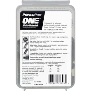 PowerPro One, pacote com 37, #1 /4 x 2-3/4", revestido com epóxi bronze, cabeça de lavagem hexagonal, Star Drive, parafusos externos multimateriais, uso em madeira, alvenaria, drywall e plástico.