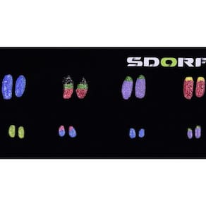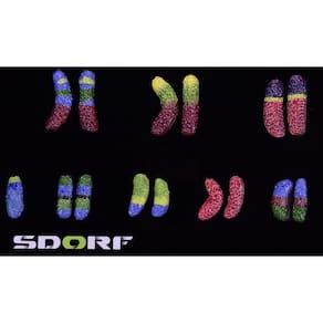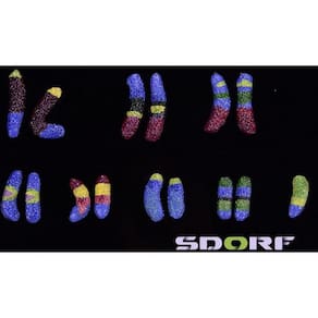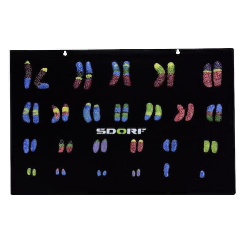 Modelo anatômico de pares de cromossomos em placa, confeccionado em PVC com pintura feita à mão e cores realísticas; Demonstra 22 pares de cromossomos (autossomos) e 1 par de cromossomo sexual (heterossomo); Com o modelo anatômico de pares de cromossomos em placa SD-5075 podemos visualizar: * Cromossomos em pares * Cariótipo com bandeamento colorido, facilitando na diferenciação das sub-regiões dos alelos; * Técnica de citogenética molecular (FISH).