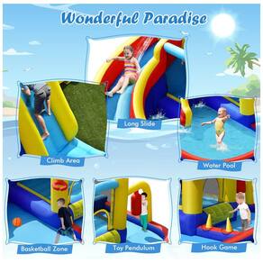 Este toboágua inflável é adequado para uso em quintal, parque, gramado, etc., e não é limitado pelo clima ou localização, permitindo que as crianças se divirtam com vários jogos em um só lugar. A área inflável é adequada para 4 crianças brincarem juntas, com um peso máximo de 120,18 quilos.