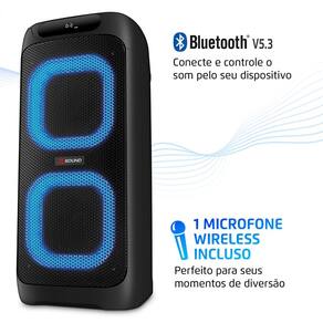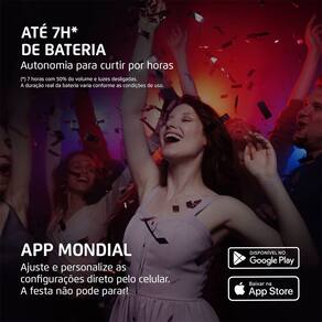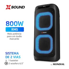 Com a Party Box XSound by Mondial PBX-800, o som potente de 800W e o sistema 2 vias (1 tweeter + 2 woofers de 6,5”) deixam a música mais marcante. As LED Color Lights pulsam na batida com 7 modos de cores, e o Bluetooth 5.3 conecta seu smartphone em segundos. Tudo isso com até 7h de bateria e 1 microfone wireless incluso para a festa continuar. Saiba mais sobre a Party Box XSound by Mondial PBX-800: