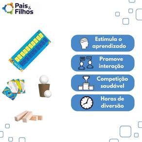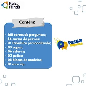 Passa ou Repassa - Pais e Filhos Ref: 793390 Um jogo divertido e desafiador para toda a família Traz perguntas e respostas em um formato inspirado no clássico programa de TV, promovendo momentos de risadas, aprendizado e muita competição saudável entre gerações. Como jogar: O jogo é disputado entre duas equipes azul e amarela e um mediador. Começa com uma prova de habilidade para definir quem inicia. A equipe da vez responde uma pergunta: - Acertou: +50 pontos - Errou: perde todos os pontos e volta ao início - Passou: a outra equipe responde ou repassa de volta Se for repassada de volta, a equipe inicial escolhe: - Responder: acerta = +200 pontos; erra = perde tudo - Pagar uma prova: cumpre = +200 pontos; falha = adversário ganha Vence quem acumular mais pontos Contém: - 168 cartas de perguntas; - 56 cartas de provas; - 01 Tabuleiro personalizado; - 03 copos; - 06 ; - 02 peões; - 05 blocos de madeira; - 01 saco zip. - Marca: Pais & Filhos - Referência: 793390 - Peças para marcação de pontos - Cartas com perguntas divididas por faixa etária - Composição: Papel Cartão, Resina termoplástica e Madeira MDF - Dimensões: 11 x 14 x 19 cm Altura x Largura x Comprimento/Profundidade - INMETRO - Segurança Compulsório - Registro 003770/2019 - Não recomendável para crianças de até 3 três anos, por conter parte s pequena s que pode m ser engolida s ou aspirada s . Homologação Inmetro: CE-BRI/IQB 006332 52225/18-062 Marca: Não Informado