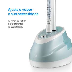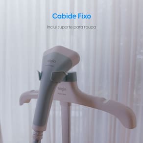Passadeira a vapor vertical com tubo telescópico ajustável, aquecimento rápido e 10 níveis de vapor ajustáveis. Inclui suporte fixo para roupas tipo cabide e luva com isolamento térmico.Lâmpada piloto