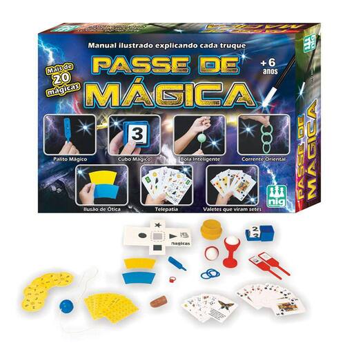 Super caixa com 20 mágicas semi-profissionais para a criança dar um verdadeiro show! Acompanha um manual desenvolvido por um mágico que descreve o passo a passo de cada número. Inclui lenço, varinha mágica, bola mágica, cartas especiais e outros componentes divertidos. Se transforme em um mágico!