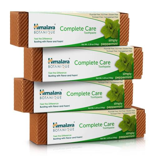 Himalaya Pasta de dente Botanique Complete Care, ervas, sabor hortelã-pimenta, combate placa, refresca o hálito, sem flúor, sem sabores artificiais, sem SLS, sem crueldade, espuma, 150 g, pacote com 4 - Pasta de dente botânica: Revele um sorriso mais brilhante com esta pasta de dente botânica. Pasta de dente sem flúor para limpar os dentes, refrescar o hálito e reduzir a placa. - Fórmula à base de plantas: a pasta de dente é suave para os dentes e gengivas enquanto limpa com eficácia. Com Neem, uma planta tropical tradicionalmente usada por suas habilidades de limpeza, e romã para combater a placa. - Sabor fresco: faz seus dentes parecerem limpos e brilhantes, sem cores ou sabores artificiais. Fórmula suave para cuidados dentários diários com espuma satisfatória e de limpeza profunda. Escolha entre menta, hortelã, canela ou hortelã. - Fácil de usar: escove completamente após as refeições ou pelo menos duas vezes por dia para um sorriso mais brilhante que parece tão bom quanto parece. Adicione esta pasta de dente à sua rotina para mostrar seus dentes saudáveis e felizes. - Feito com bondade: fórmula vegana e livre de crueldade torna esta uma adição saudável à sua rotina de higiene bucal. Sem fluoreto, glúten, triclosan, SLS, carragenina ou cores ou sabores artificiais. De uma empresa familiar, confiável desde 1930.