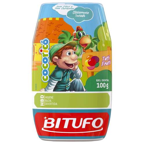 A turminha de Cocorico vai ajudar você a manter a saúde de sua boca sempre em dia. O Gel Dental Bitufo possui um sabor delicioso de tutti-frutti e não contém flúor e corantes. Um produto ideal para higiene infantil diária na fase de treinamento de escovação.