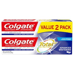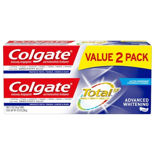 Colgate Pasta de dente Colgate Total Advanced Whitening com flúor, pasta de dente multibenefícios com alívio de sensibilidade e proteção de cavidade – 144 g (pacote com 2), 144 g (pacote com 2), 299 g - Pasta de dentes clareadora com fórmula inovadora que oferece vários benefícios - Pasta de dente de remoção de manchas que evita novas manchas e remove as existentes - Combate bactérias nos dentes, língua, bochechas e gengivas para saúde total da boca - A fórmula estanosa da pasta de dente com flúor protege contra cáries, sensibilidade e gengivite - Melhora a força do esmalte, neutraliza o odor, evita o acúmulo de placa bacteriana e controla o tártaro - Proteção antibacteriana de pasta de dente para uma boca mais saudável em comparação com pasta de dente não antibacteriana com flúor com duas vezes por dia, quatro semanas de uso contínuo - Pacote de 2 tubos de pasta de dente com 144 g em cada; um total de 290 g