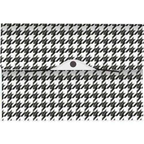 Pasta sanfonada em polipropileno com 12 divisórias estampada em xadrez no clássico xadrez Pied de Poule. É elegante. É moderno. É estiloso. A sofisticação se faz presente aqui. Tamanho A4. Possui visores em polipropileno transparente e acompanha etiquetas para identificação das divisórias. Fechamento com elástico.