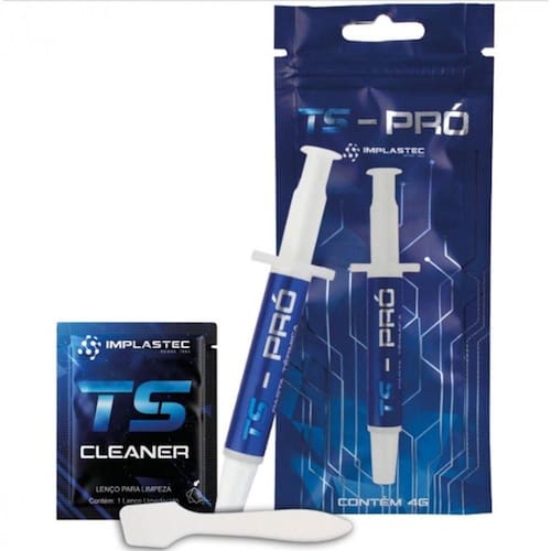 Pasta Termica Ts Pro Cinza 4 Gramas PASTA TÉRMICA CINZA TS PRO - 4 GRAMAS A Pasta Térmica TS - Pró foi desenvolvida com o objetivo de atender a necessidade crescente de resfriamento em componentes eletrônicos devido a sua alta condutividade térmica, viscosidade adequada a aplicação, durabilidade e estabilidade. Tais características são possíveis devido à sua moderna que combina uma mistura materiais com elevada condutividade térmica juntamente com o fluído de silicone especial, garantindo assim uma performance excepcional nas mais aplicações. Principais Aplicações: A Pasta Térmica TS - Pró foi desenvolvida especialmente para o uso em CPU, placas de vídeo, vídeo games e qualquer outra aplicação que exija uma alta dissipação térmica. Características Técnicas: Cor: Cinza Claro; Consistência Grau NLGI: 2; (ABNT NBR 11345): 265-295mm/10; Condutividade Térmica: 6,2 W/mk; Densidade: 2,0 g/ml. Conteúdo da Embalagem: 1x Seringa aplicadora de 4 gramas; 1x Espátula para retirada da pasta antiga e aplicação da TS PRÓ; 1x Sachê com álcool para limpeza. Ean: 7898446730031
