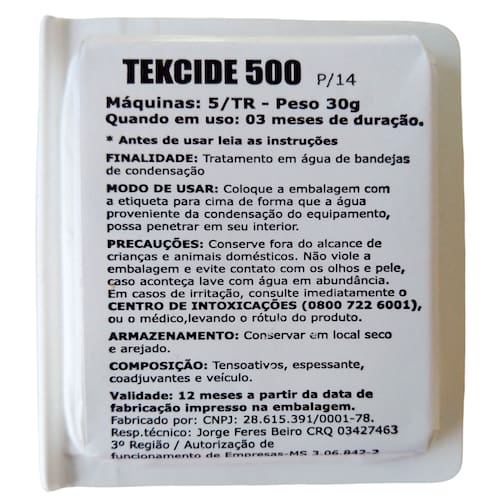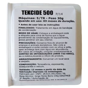 PASTILHA BACTERICIDA TEKCIDE 500 P14 - 30g - 5TR Indicado para tratamento da água na bandeja de condensado em Ar Condicionado(máquinas Self e Fan Coil) 5 TR. Para máquinas de maior capacidade (até 10 TR), utilize a pastilha de 60g. Destina-se a inibir o crescimento e proliferação de micro-organismos e maus odores em sistemas de refrigeração. Também impossibilita o entupimento de drenos, evitando despesas em consequências de transbordamentos da água e contaminações de micro-organismos nos locais onde as máquinas estão instaladas. Antes de utilizar o produto na bandeja da máquina e ou aparelho de Ar Condicionado, realize a limpeza da bandeja. Depois deposite a pastilha na bandeja da máquina ou bandeja do aparelho de Ar Condicionado, com o rótulo para cima. O produto atua pela adsorção à membrana citoplasmática das células microbianas, interferindo no crescimento e na constante divisão celular. Produto licenciado pela Anvisa. Postado com nota fiscal em até 24h.