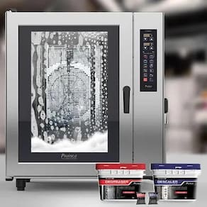 As pastilhas desengordurantes Degreaser são indicadas para a limpeza da câmara dos fornos combinados TSi* e C-MAX*, pois possuem a formulação adequada para uma limpeza eficiente e sem danificar o equipamento. Também são adequadas para fornos combinados de outras marcas, que possuam a função de higienização automática com o uso de pastilhas.