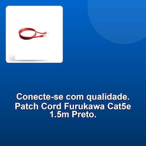 Compre o Patch Cord Furukawa Cat5E e experimente a diferença que a qualidade e a confiabilidade fazem na sua experiência de conexão. Como empresa que se preocupa com a satisfação do cliente, nos dedicamos a oferecer produtos impecáveis e uma entrega ágil, proporcionando uma experiência de compra completa e tranquila. Conecte-se com confiança e velocidade através do Patch Cord Furukawa Cat5E 1.5M Preto T568A 35104007. Elaborado com a qualidade impecável que a Furukawa representa, este cabo Ethernet garante uma transmissão de dados rápida e estável para suas necessidades de conectividade.
