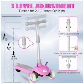 As rodas piscantes divertidas com LED são alimentadas por um sistema autogerado, que acenderá automaticamente as rodas quando seus filhos começarem a andar e não houver necessidade de bateria. As luzes LED coloridas no volante que brilham e se destacam proporcionam mais diversão para a criança brincar, o que também é uma garantia de segurança para andar à noite. A Scooter Elétrica Infantil possui 3 alturas ajustáveis e 3 guidões ajustáveis, além de um pedal extralargo que acomoda uma carga máxima de 50 kg.