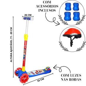 O Patinete Patrulha da Justiça é super radical, o sonho de qualquer menino! Ele possui altura ajustável, luzes nas rodas. Possui 3 rodas garantindo mais estabilidade e segurança para a criança que ainda está aprendendo a andar, além de ser leve e resistente, tudo isso em um design super moderno! Acompanha capacete, joelheiras e cotoveleiras para garantir a segurança dos pequenos enquanto se divertem. É desmontável e prático – Montar sob a supervisão de um adulto.