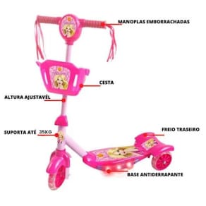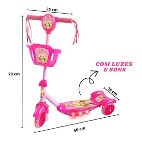 Patinete com cestinha e detalhe no guidão com desenho exclusivo da Dm Toys da Belinda que as meninas irão amar. Ele acende luz na base e emite som musical.