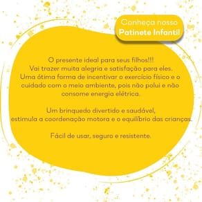 Com um design colorido e atrativo, o patinete é uma excelente escolha para estimular a atividade física e o desenvolvimento motor das crianças, ao mesmo tempo em que proporciona muita diversão. Construído com materiais leves e duráveis é fácil de manusear e transportar, permitindo que as crianças o levem para qualquer lugar, seja no parque, calçada ou em um passeio com a família.