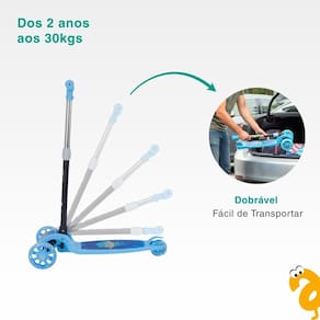 As rodas com luzes de LED dão um toque mágico, acendendo conforme o movimento e criando um verdadeiro espetáculo de cores a cada passeio. E quando a diversão acabar, o patinete pode ser dobrado rapidamente, ocupando pouco espaço e facilitando o transporte, ideal para levar no carro, guardar no armário ou transportar em viagens.
