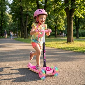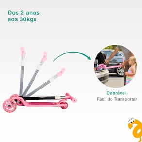 As rodas com luzes de LED dão um toque mágico, acendendo conforme o movimento e criando um verdadeiro espetáculo de cores a cada passeio. E quando a diversão acabar, o patinete pode ser dobrado rapidamente, ocupando pouco espaço e facilitando o transporte, ideal para levar no carro, guardar no armário ou transportar em viagens.