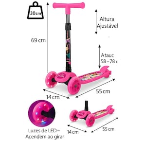 Peso suportado: 30 kg O patinete ideal para garantir diversão com segurança e estilo este modelo é inspirado nas adoradas princesas disney, perfeito para estimular a imaginação das crianças enquanto se movimentam com liberdade e alegria. Principais benefícios: Mais estabilidade: com 3 rodas, oferece mais equilíbrio para iniciantes. Rodas com luzes: as rodas frontais acendem conforme giram, tornando o passeio ainda mais divertido e chamativo. Altura ajustável: guidão com regulagem que se adapta ao crescimento da criança. Freio traseiro: fácil de acionar, proporciona mais segurança durante o uso. Estampa exclusiva disney princesas: um charme a mais para as pequenas aventureiras