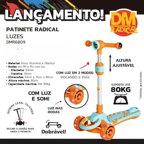 O Patinete Radical Luzes é muito legal. Possui som, luz nas rodas e no deck, farol com luz em dois modos - piscando e fixa. O patinete é dobrável, facilitando no momento de guardar e transportar. Com sistema lean-to-steer, é só inclinar o guidão para o patinete virar.