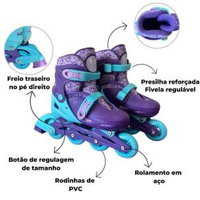 - produto certificado pelo inmetro e projetado com materiais de alta qualidade garantindo o conforto e agilidade necessária para manobras. - os patins também contam com sistema de rodas estáveis e duas presilhas reforçadas para uma melhor estabilidade dos pés. - freio traseiro para controle de velocidade, cano flexível e sistema de ajuste para se adequar ao tamanho - o produto acompanha um kit completo de segurança composto por um capacete, joelheiras, cotoveleiras e luvas de proteção - faixa etária recomendada: acima de 4 anos - peso máximo: 45 kg - corpo em polipropileno com bota interna em tecido forrado com espuma - alta absorção de impacto - fecho em metal e presilha polipropileno.