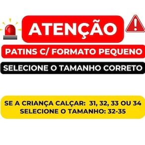 Informações importantes: - comprar sempre dois números acima do que a criança usa de tênis - se a criança usa tênis tamanho 31, 32, 33 ou 34, é recomendável comprar patins ajustáveis que vão do tamanho 32 ao 35. - peso máximo: 45 kg