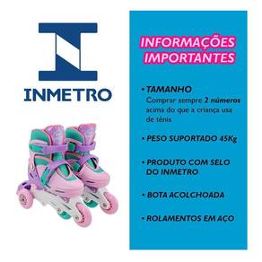 - Contém: Par de patins com 3 rodas cada nº 30 a 33 , Joelheiras, cotoveleiras, proteção para mãos e um lindo capacete