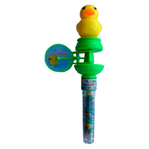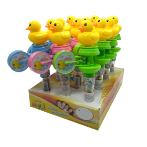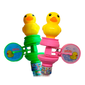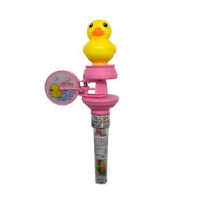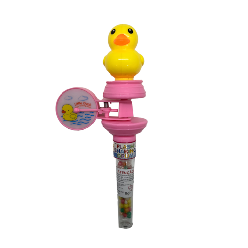 Apresentamos o Pato Beat, o companheiro musical que vai alegrar e deliciar as crianças! Este simpático patinho está ligado à parte superior de um tubo recheado de balinhas sabor Tutti Frutti e traz consigo um tambor giratório que acende e apaga, proporcionando uma experiência visual e sonora única.