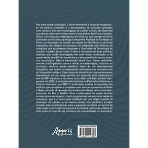 Por meio desta publicação, o leitor entenderá a situação de abando-no de prédios tombados e o apontamento de soluções aplicadas com sucesso. Em uma investigação de caráter crítico, são descritas as práticas intervencionistas sobre o patrimônio histórico e arquite-tônico, com foco nas adaptações dos edifícios que fizeram parte do Complexo de Oficinas da antiga Companhia Paulista de Estradas de Ferro, no município de Jundiaí, no estado de São Paulo e, de forma específica, em relação ao processo de adaptação nos edifícios do complexo que atualmente compõem a Faculdade de Tecnologia de Jundiaí. A partir dessa linha, é feita a discussão de duas políticas públicas que estão interligadas em uma única construção: a de preservação de edifícios tombados e a de expansão do ensino supe-rior tecnológico. Para a elaboração deste livro, foram realizadas revisões bibliográficas sobre a teoria da restauração, incluindo os principais teóricos dessa temática, além de um levantamento fotográfico que ilustra as adaptações realizadas e as compara com as fotografias antigas. Esse conjunto de edifícios, que permaneceu abandonado por um longo período, foi adquirido pela prefeitura no ano de 2001 e passou a ter novos usos, além da Fatec Jundiaí, inau-gurada em 2002, e tombado pelo Instituto do Patrimônio Histórico e Artístico Nacional, em 2004. A publicação analisa as fachadas dos edifícios que compõem o complexo com base nos preceitos de Boito e Riegl, além da observação dos pontos abordados pelos seus ante-cessores, Le Duc e Ruskin. Com a elaboração de novas funções sociais para esse espaço, criam-se garantias para a preservação do complexo, que é o único bem tombado por um órgão federal no município de Jundiaí, e, ao mesmo tempo, em específico à Fatec Jundiaí, está a contribuição para o aumento da oferta de cursos de nível superior por meio dessa que é a primeira instituição pública de nível superior que não faz cobrança de mensalidades no município.