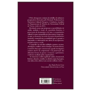 O livro abrange um conjunto de trabalhos de talentosos pesquisadores formados pelo Mestrado Profissional em Patrimônio Cultural, Paisagens e Cidadania, vinculado ao Departamento de História da Universidade Federal de Viçosa, criado em 2013. Abordando temas que perpassam as possibilidades de análise atreladas à noção de consciência histórica, à preservação de documentos e de bens, e ao patrimônio cultural, os textos nesta publicação demonstram a importância que as discussões em torno da noção de patrimônio (material e imaterial) têm na atualidade para se garantir o testemunho e o referencial de seus valores, de sua representatividade técnica e social.